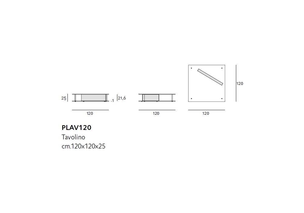 Plane designed by Massimo Mariani for Living Divani is a sculptural piece that carries tha mind to the expressive side of geometry, the delicate balance between solids and spaces. Table made of two tempered glass panels, 120x120cm with 12mm thick, with rounded corners and beveled edge. The lower glass panel has three through holes to house two pins to insert a slab of solid walnut or white Carrara marble. Both version are finished with a slip proof transparent matt varnish on the upper surface. The third hole houses another pin to support the upper glass panel, to which is fixed, with a UV-cured adhesive, a small plate with a conical counterbore to align it with the pin itself. Stainless steel AISI 304 feet fixed to the glass panel through a UV-cured adhesive, paired with black plastic tips.