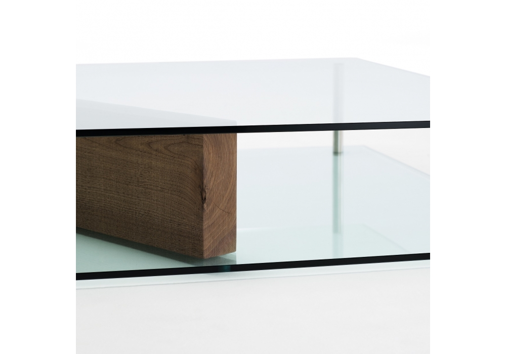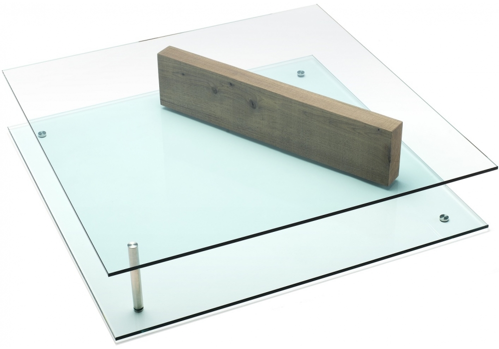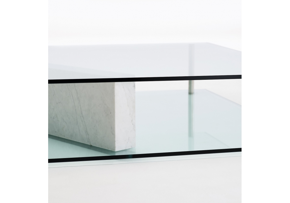 Plane designed by Massimo Mariani for Living Divani is a sculptural piece that carries tha mind to the expressive side of geometry, the delicate balance between solids and spaces. Table made of two tempered glass panels, 120x120cm with 12mm thick, with rounded corners and beveled edge. The lower glass panel has three through holes to house two pins to insert a slab of solid walnut or white Carrara marble. Both version are finished with a slip proof transparent matt varnish on the upper surface.