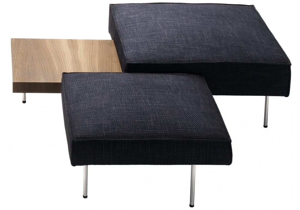 Upland designed by Massimo Mariani for Living Divani is an element composed by a coffee table and two seating elements, with supporting frame in epoxy powder coated steel. Stainless steel feet ø15mm, matt satin-finish, screwed to the base with a bushing. Table top in MDF 20mm thick, veneered with elm or Thermo oak plates with water-based acrylic paint finish. Seating elements in multilayer, padded in differentiated density polyurethane foam covered in needle punched, resinated.