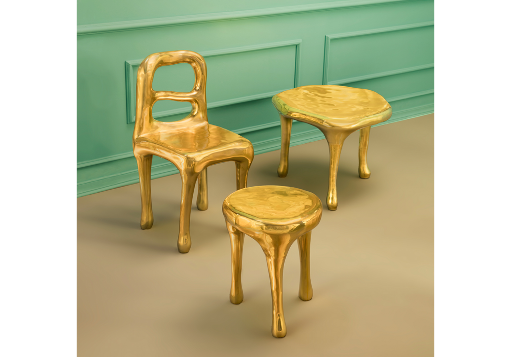 Glee producida por Scarlet Splendor es una mesa auxiliar de tres patas hecha de latón pulido y cubierta con una laca protectora.