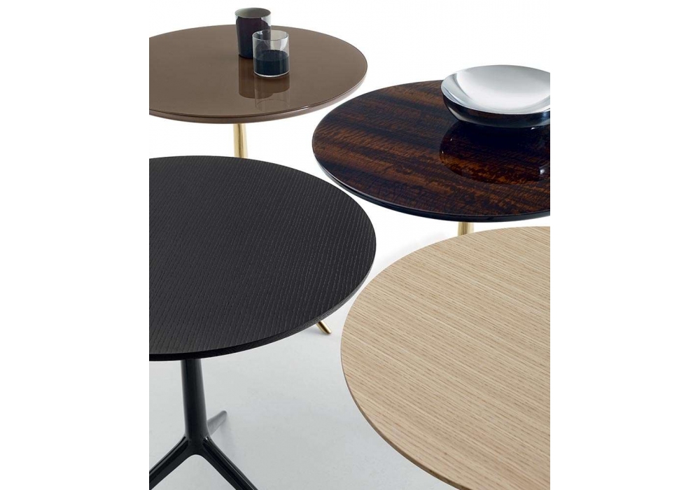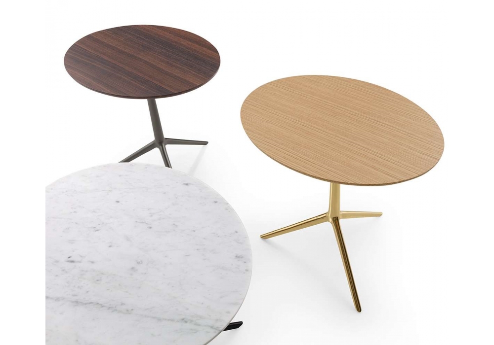 Cozy diseñada por Antonio Citterio para B&B Italia es una mesa auxiliar con estructura de latón y tablero en panel de fibra de madera MDF chapada, cristal o mármol en diferentes acabados.