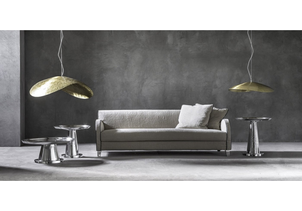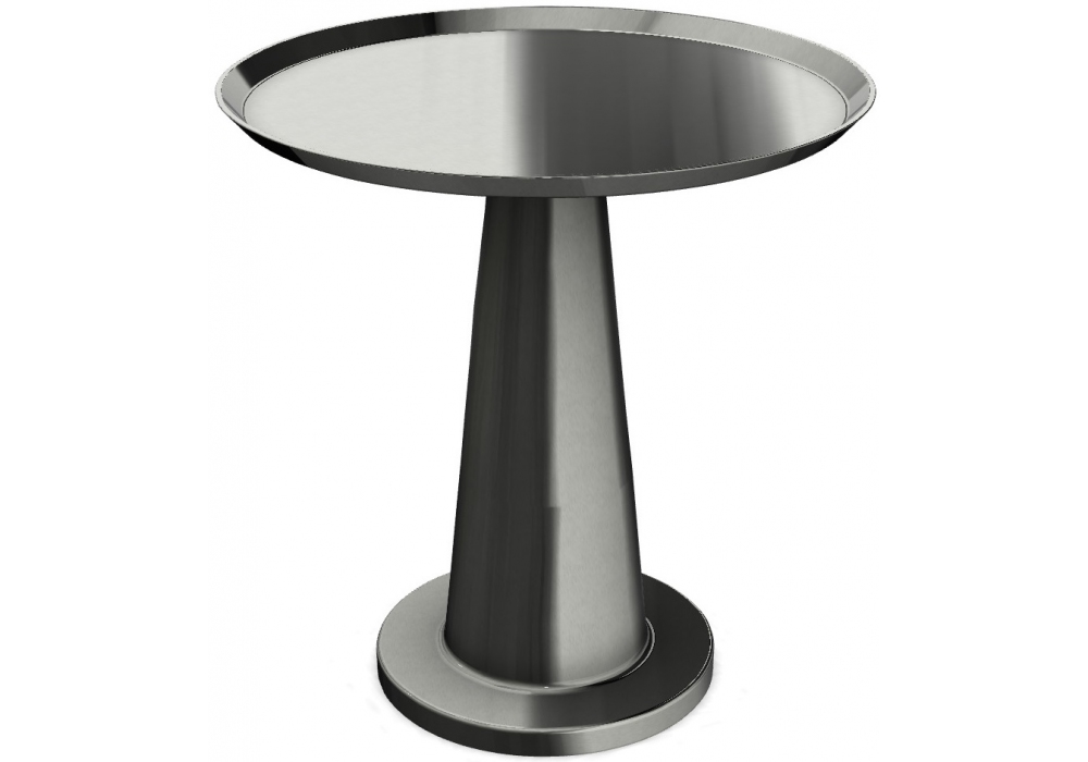 Next diseñada por Paola Navone para gervasoni es una mesita con base y parte superior de aluminio pulido.