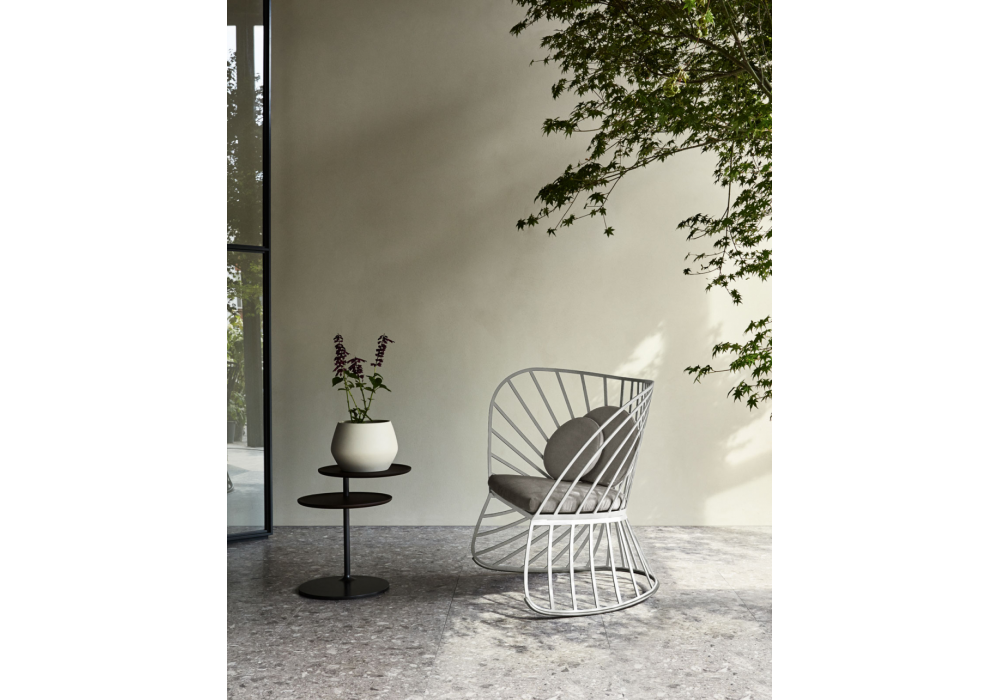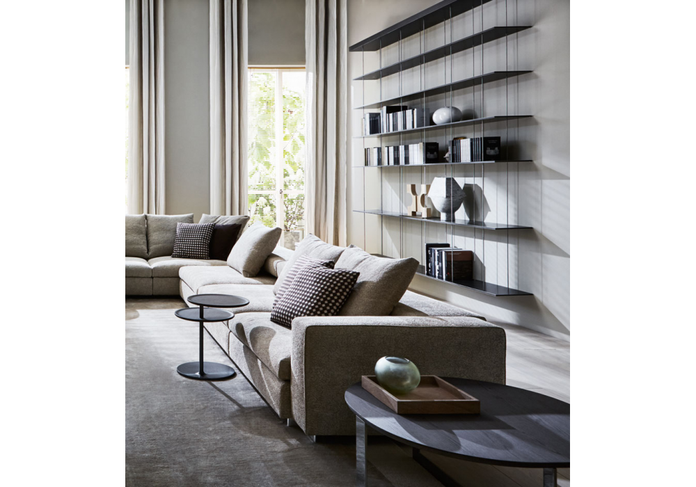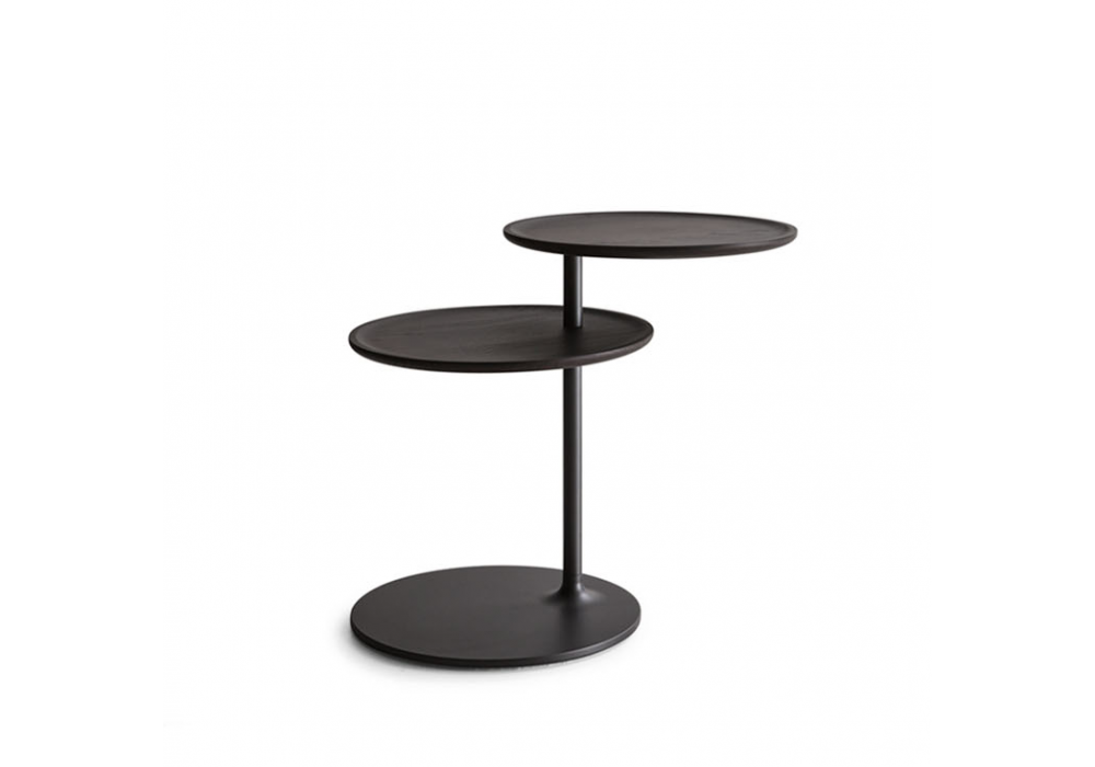 Vicino diseñada por Foster+Partners para Molteni&C es una mesa auxiliar con estructura de metal con dos superficies en la parte superior. La superior es giratoria y la inferior es fija.