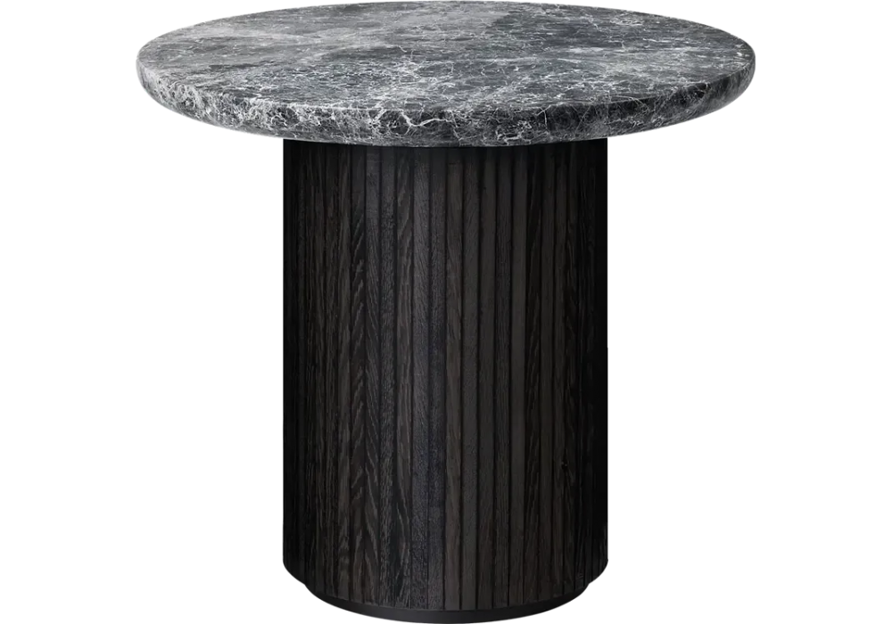 Moon Lounge diseñada por Space Copenhagen para Gubi es una mesa auxiliar con tapa de madera o mármol y base de madera de roble a juego con la tapa. Disponible en diferentes acabados.