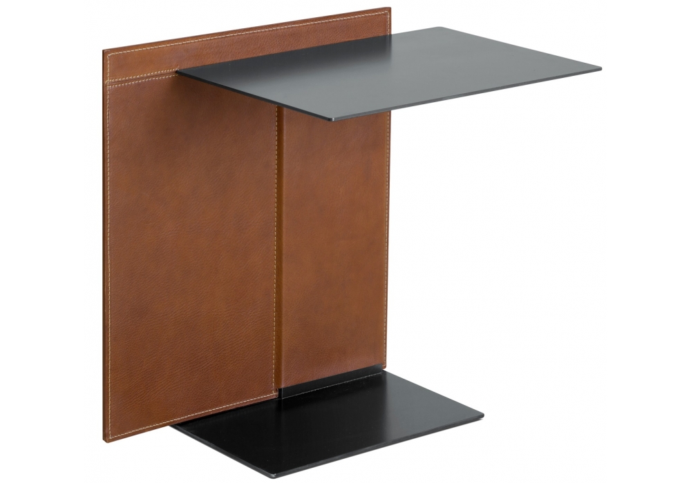 Note diseñada por LucidiPevere para Lema es una mesa auxiliar con estructura de metal en acabado bronce y bolsillos para accesorios de cuero.