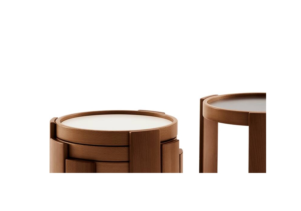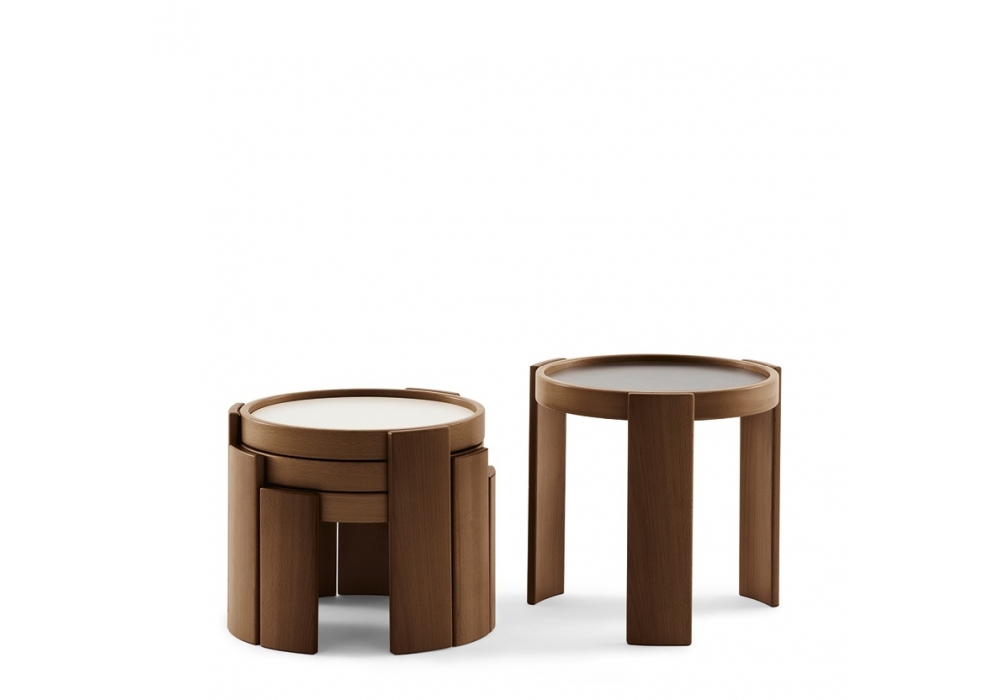780/783 diseñado por Gianfranco Frattini para Cassina es una colección de 4 mesitas. Estructura en haya color nogal o lacado negro.