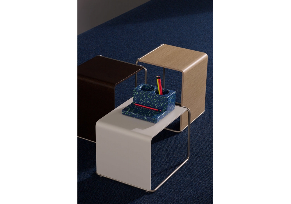 Ueno diseñada por Takashi Shinozaki para Lapalma es una mesa auxiliar apilable, que se puede trasformar en pequeño taburete si necesario. Estructura en tubo de acero inoxidable Aisi 304 arenado, encimera/asiento en varios acabados. Inspirado en los bancos de las escuelas japonesas, este elemento simboliza el encuentro perfecto entre línea y superficie: el tubo vira y encuentra el plano doblado en L. Vacío y lleno se encastran con simplicidad ortogonal, creando un volumen de ángulos siempre redondeados, suavizados por la curva.