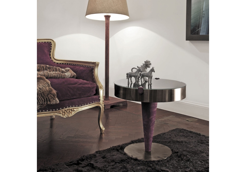 Prince diseñada por Giuseppe Viganò para Longhi es una mesa auxiliar con tablero interno y columna revestida en cuero. Superficie superior en cristal transparente perfilado. Borde y base en metal rectificado Disponible en diferentes acabados.
