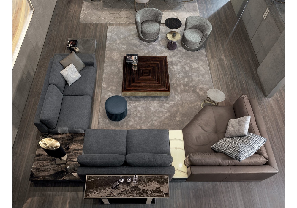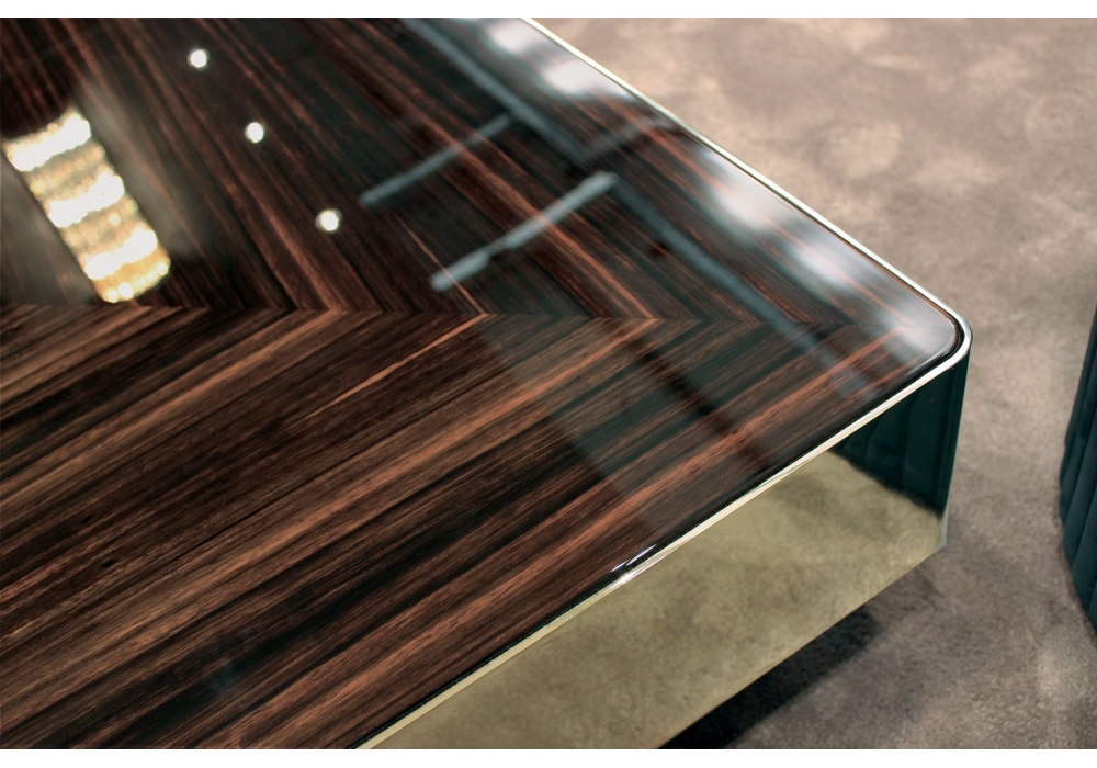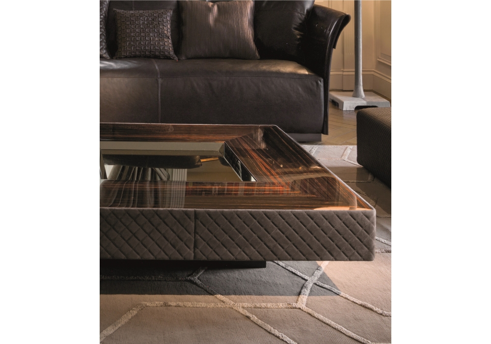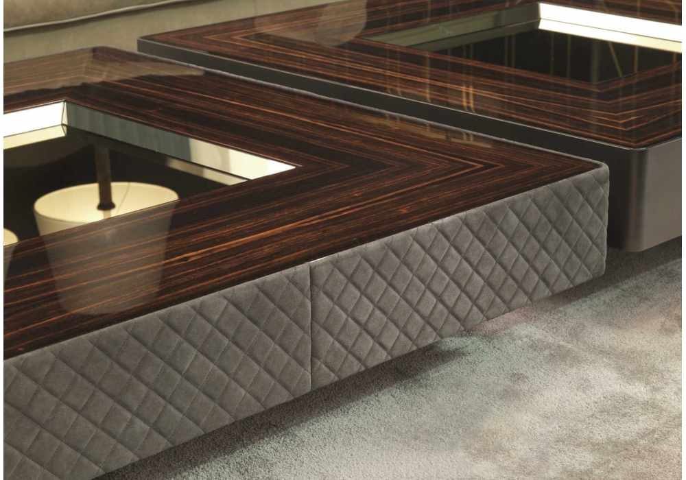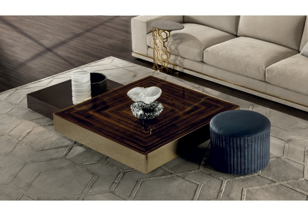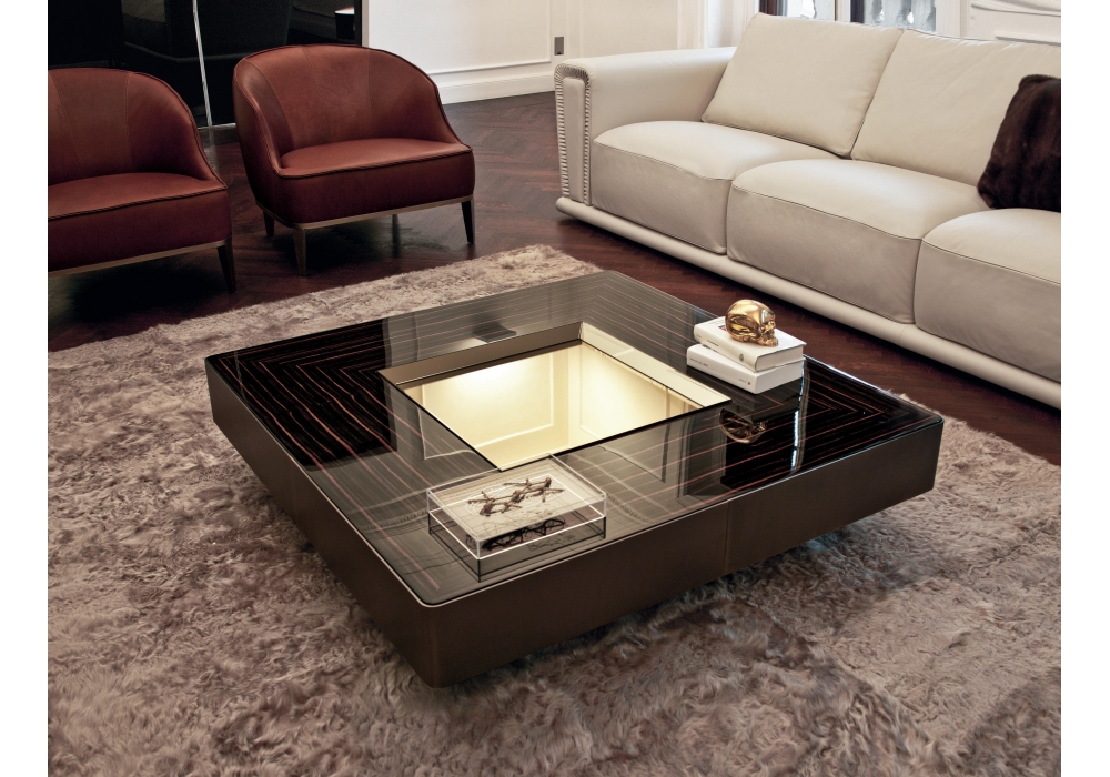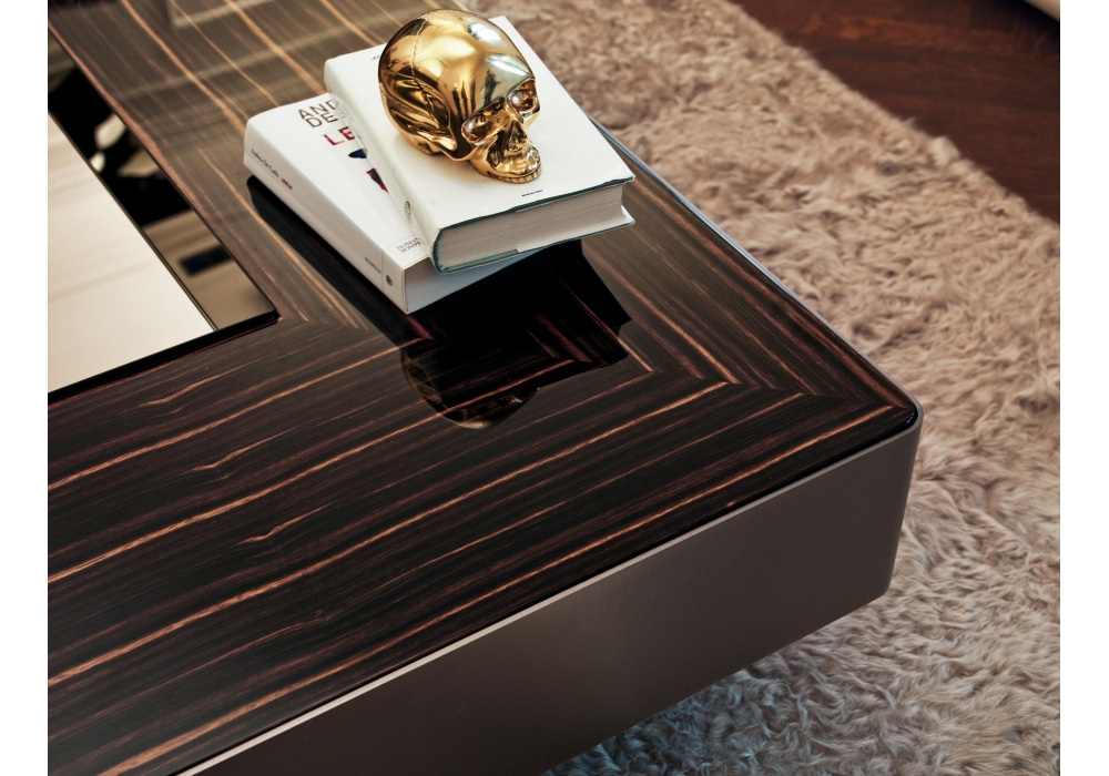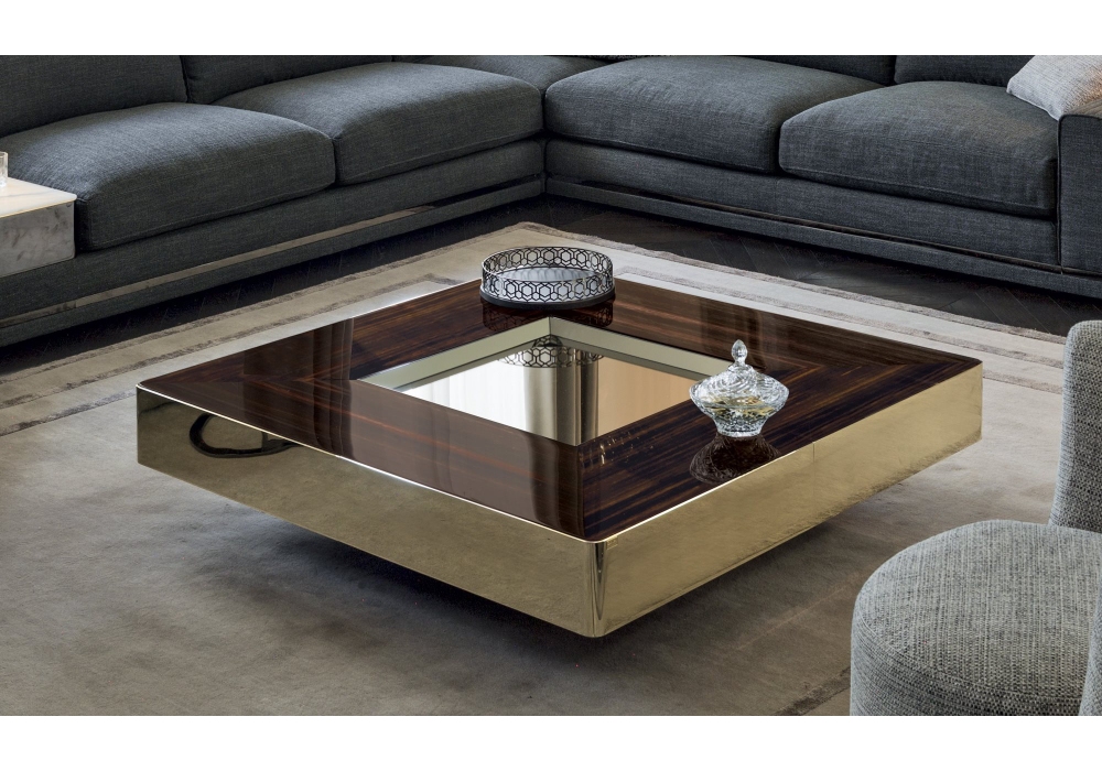 Lord diseñada por Giuseppe Viganò para Longhi es una mesita con bandeja central revestida en bronce o espejo ahumado. Banda superior y exterior disponible en varios acabados. También disponible sin bandeja central.