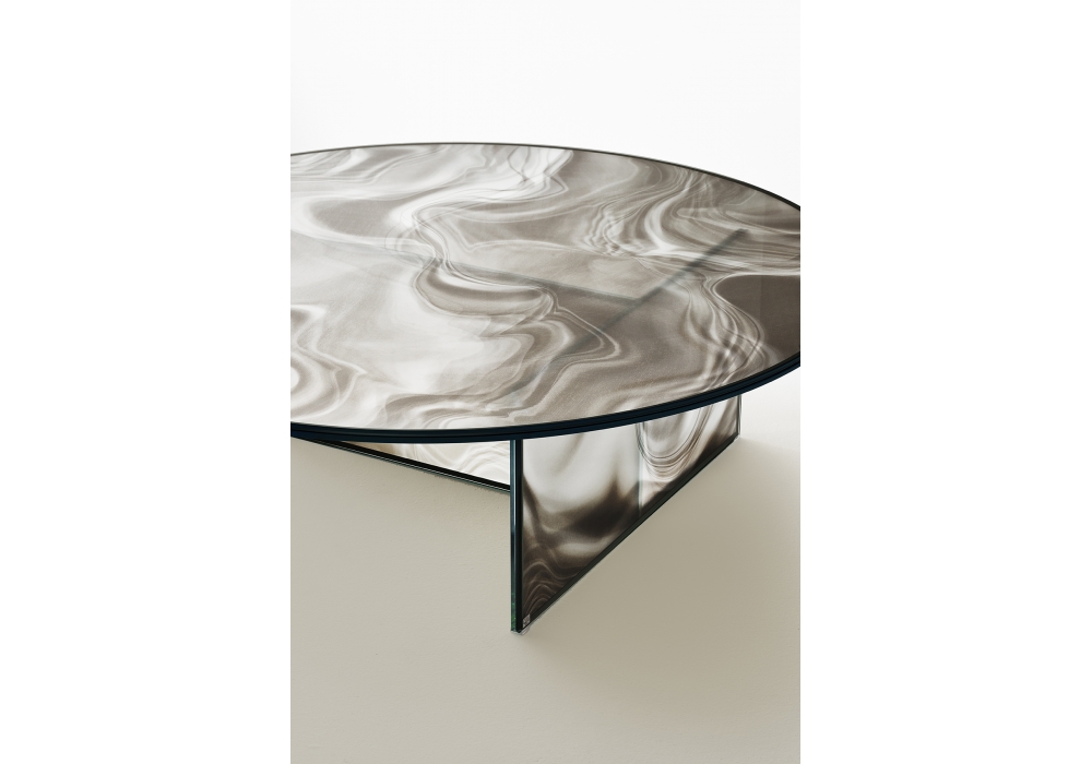 Liquefy diseñada por Patricia Urquiola para Glas Italia es una mesa auxiliar de cristal transparente extralight templado, con una decoración que se asemeja al mármol. Gracias a un efecto sorprendente, las venas parecen dinámicas y variables dependiendo del punto de observación. Disponible en diferentes acabados y dimensiones.