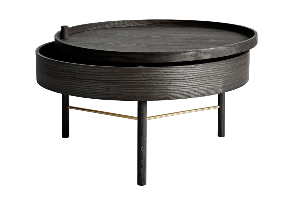 Turning Table diseñada por Theresa Rand para Audo Copenhagen es una mesita realizada en madera, disponible en 2 acabados diferentes: fresno teñido negro/latón o roble blanco/cromo negro. Turning Table ofrece una forma sencilla de mantener el salón limpio y ordenado: el compartimento debajo de la parte superior se puede utilizar para guardar, por ejemplo, libros y revistas.