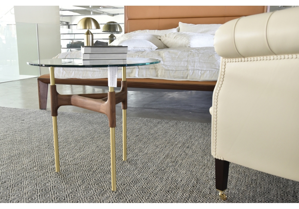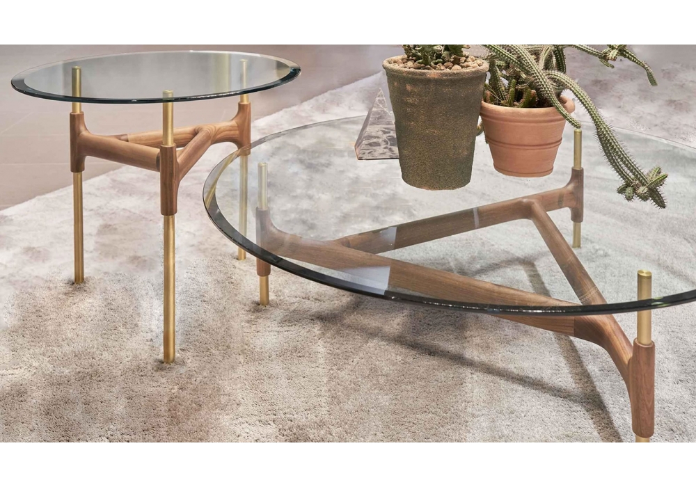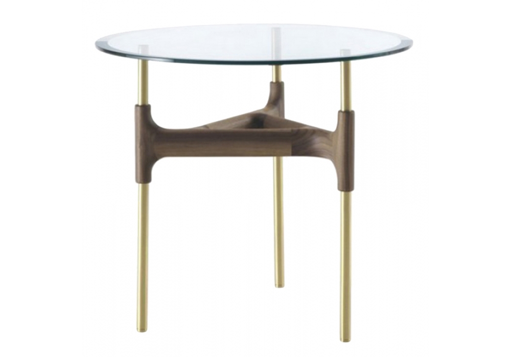Joint diseñada por M. Marconato & T. Zappa para Porada es una mesita con estructura de latón cepillado pintado transparente y tapa de cristal transparente templado y biselado (espesor mm. 12). Elemento decorativo en nogal canaletta macizo al que se fijian los soportes de la tapa y los pies. Disponible en 2 dimensiones.