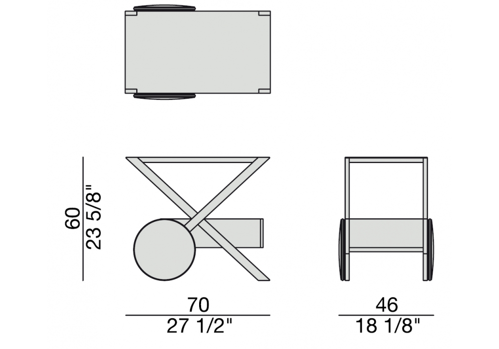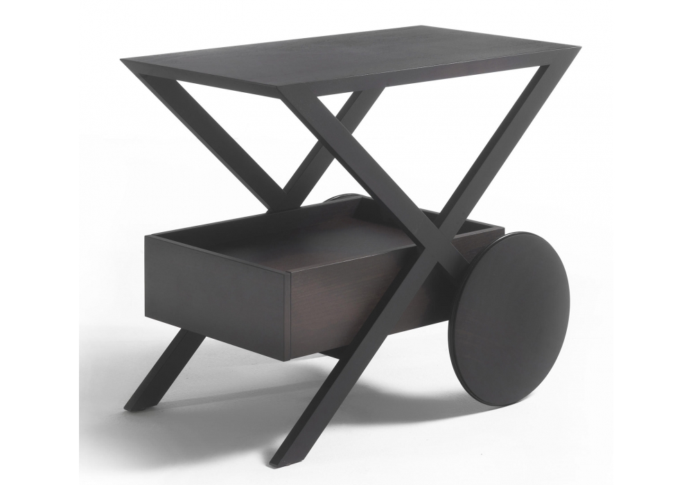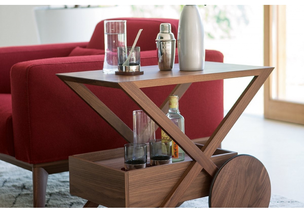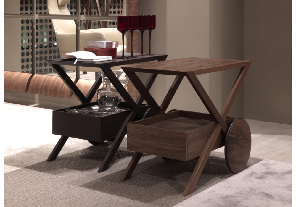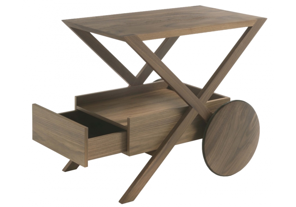 Spritz diseñada por D.Dolcini para Porada es una mesa auxiliar de servicio en nogal canaletta, con ruedas de madera y cajón con interior revestido de cuoietto.