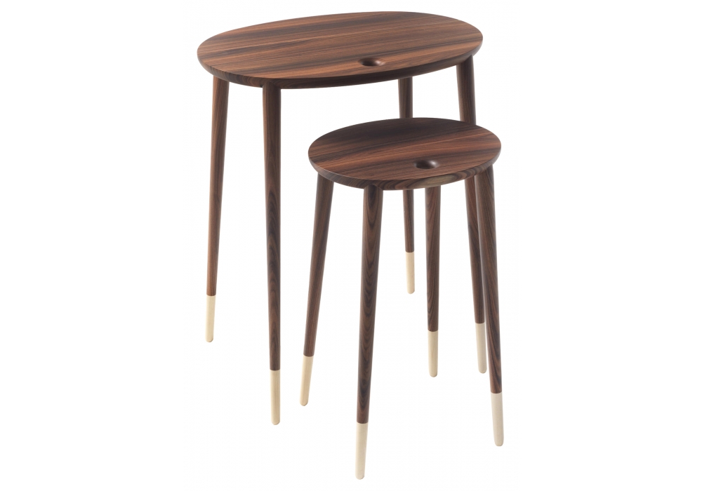 Rogers diseñado por Carlo Ballabio para Porada es un set de 2 mesitas en nogal canaletta macizo disponible en 2 diferentes acabados con pies en arce natural.