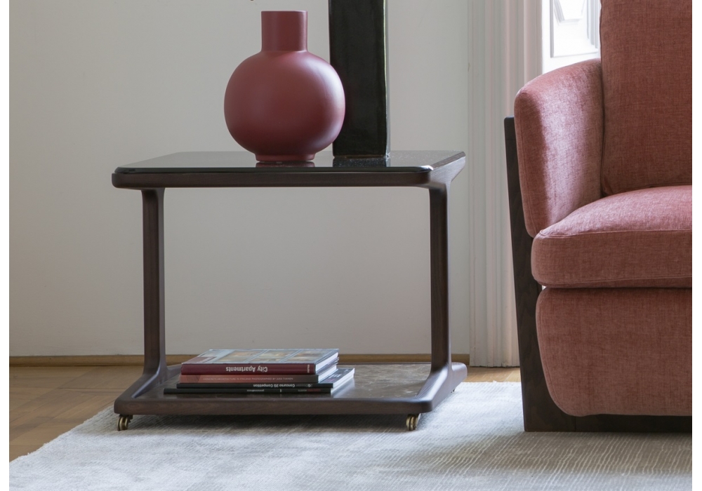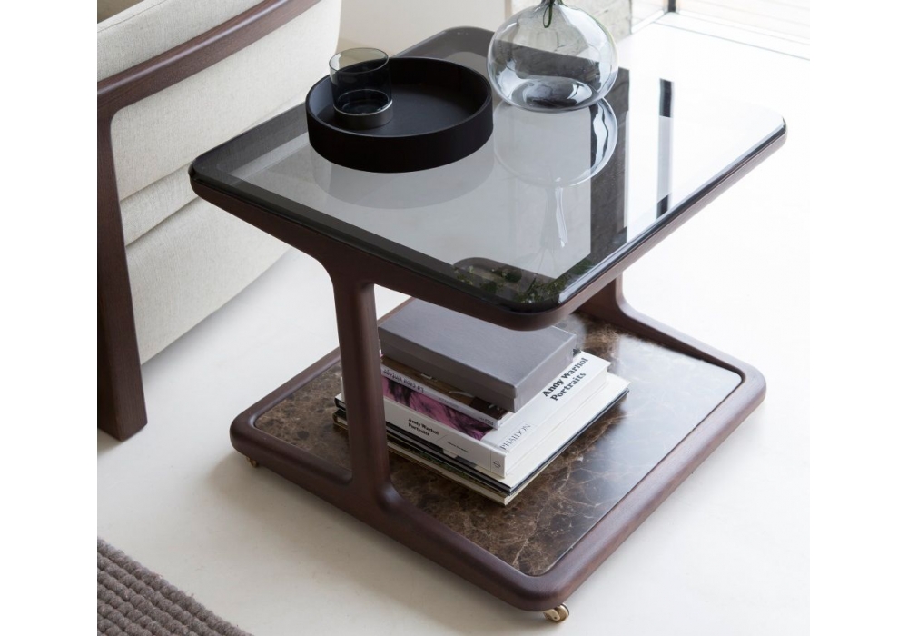 Script diseñada por Emmanuel Gallina para Porada es una mesita con ruedas con estructura en fresno macizo disponible en diferentes acabados. Tapa inferior de mármol y tapa superior de cristal templado ahumado con borde redondeado (espesor mm. 10).