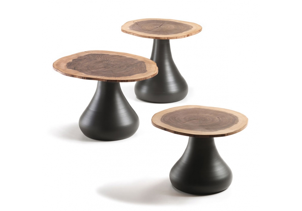 Rio diseñada por Giorgio Cattelan para Cattelan Italia es una mesa auxiliar con base en aluminio barnizado gofrado en colores blanco o grafito. Sobre en MDF contrachapado con sección de tronco de árbol de nogal. Disponible en diferentes medidas. Medidas del sobre indicativas, cada pieza es única y distinta en la forma y en la medida.