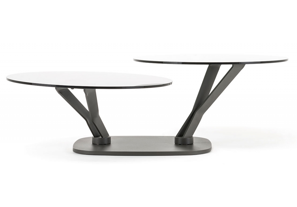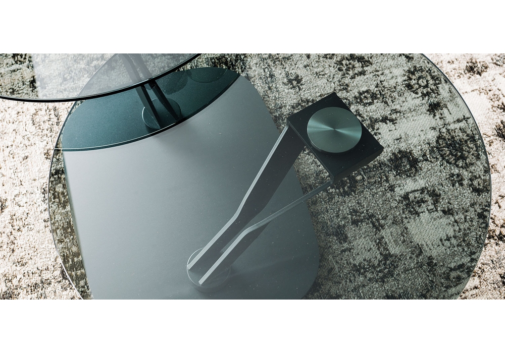 Viper diseñada por Emanuele Zenere para Cattelan Italia es una mesita con base realizada acero barnizado gofrado graphite. Disponible en diferentes medidas, con una o dos sobres rotatorios en cristal transparente o fumé.