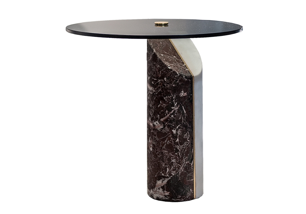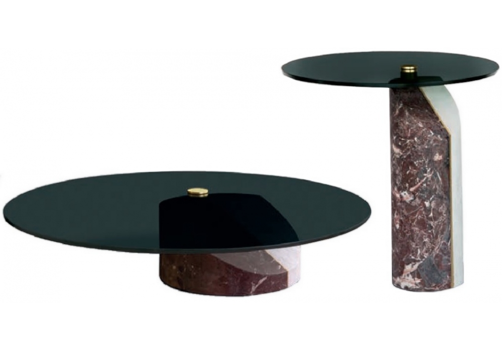 Ziggy diseñada por Pietro Russo para Baxter es una mesa auxiliar con base de mármol: Blanco Gioia / Rosso Lepanto y superficie en vidrio fumée. Disponible en 2 medidas.