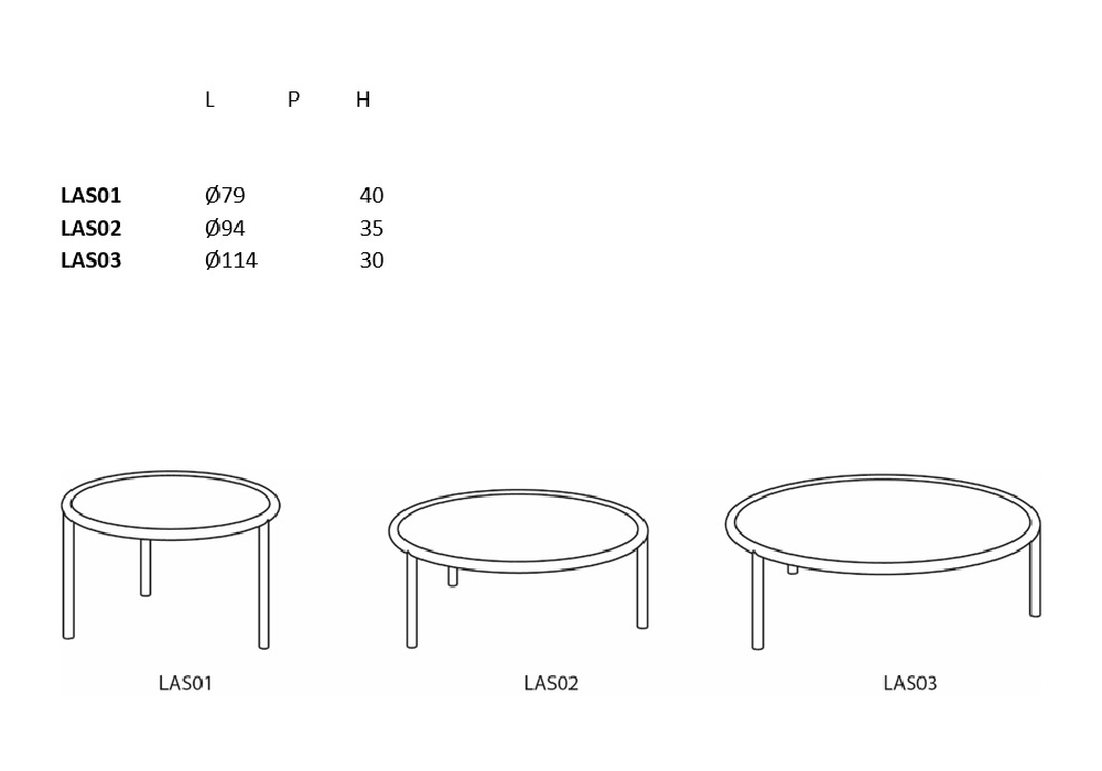 | Dimensiones | Ø 79 x H 40 cm (LAS01); Ø 94 x H 35 cm (LAS02); Ø 114 x H 30 cm (LAS03) |