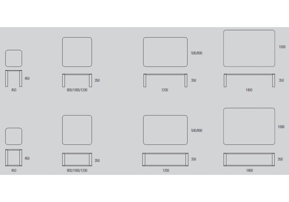 | Dimensiones | 45 x 45 x H 45 cm; 80 x 80 x H 35 cm; 100 x 100 x H 35 cm; 120 x 120 x H 35 cm; 120 x 50 x H 35 cm; 120 x 80 x H 35 cm; 140 x 100 x H 35 cm |
