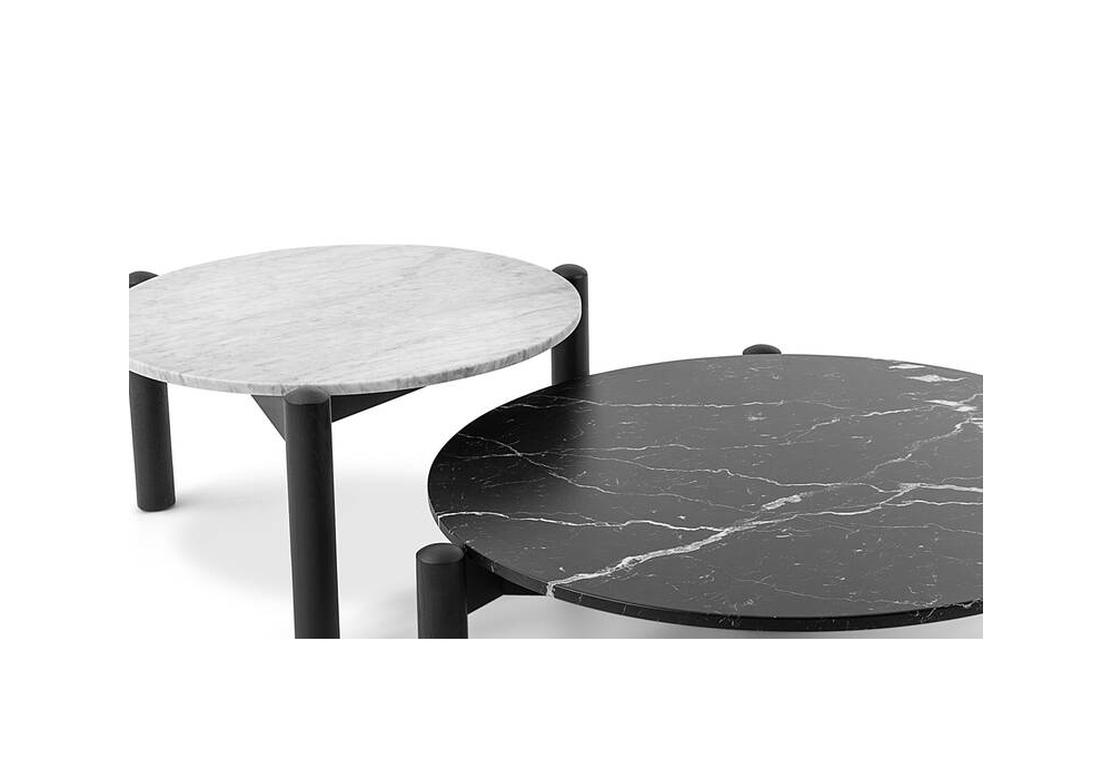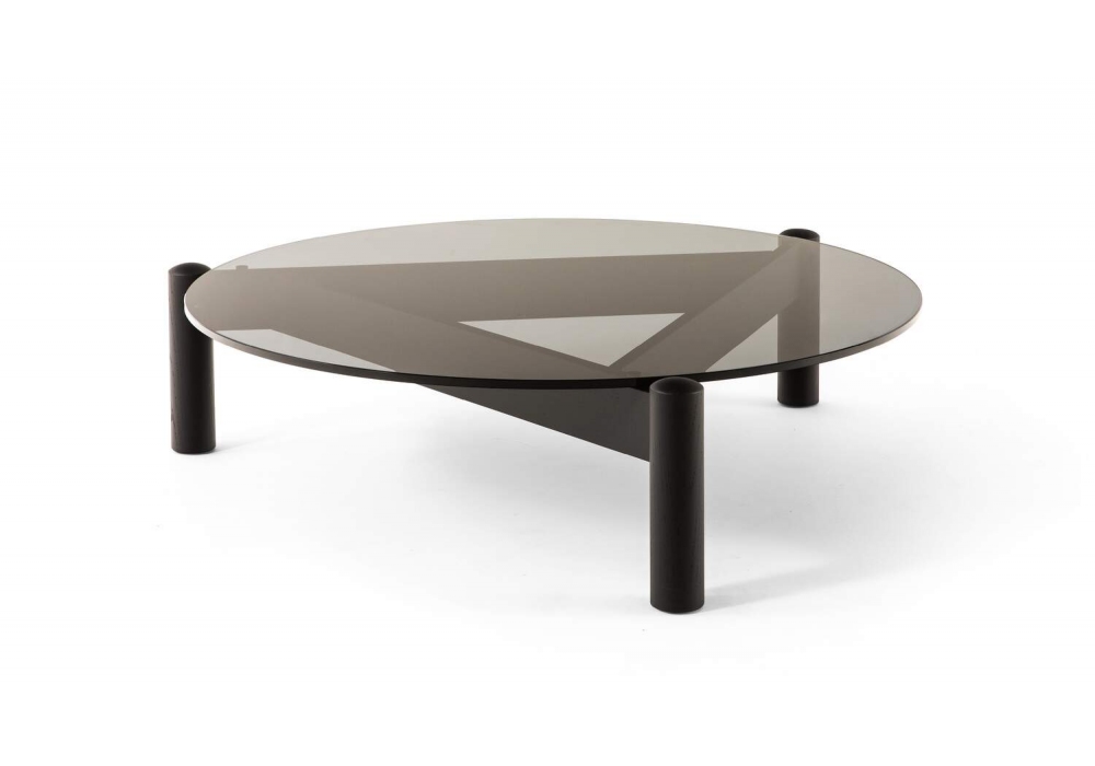 535 Table a Plateau Interchangeable diseñada por Charlotte Perriand para Cassina es una mesita con estructura de fresno teñido de negro y tablero de cristal extraclaro o mármol.