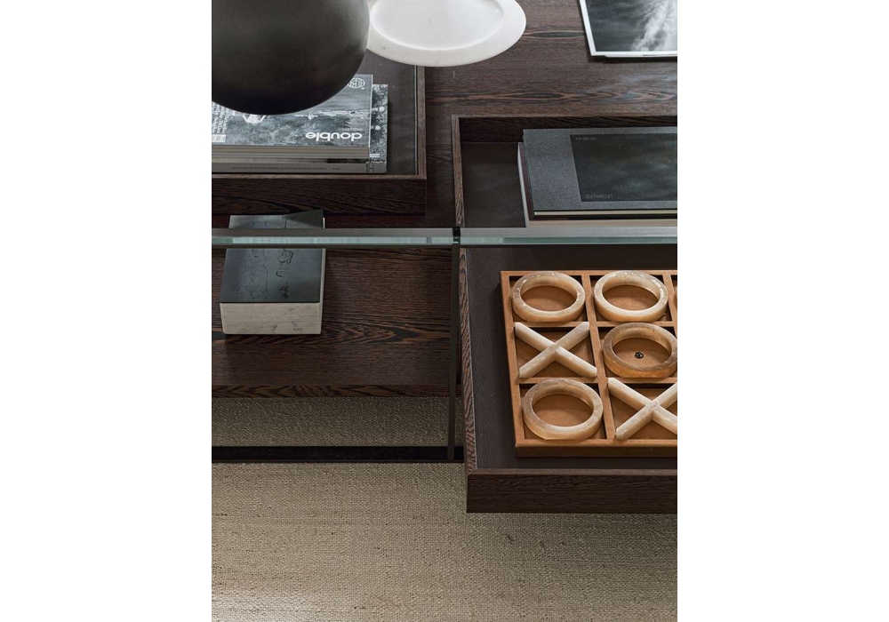 Lithos diseñada por Antonio Citterio para Maxalto es una mesita con estructura de acero pintado; bandejas extraíbles de roble en diferentes acabados, con fondo revestido en piel. Tapa de cristal extralight transparente. Disponible en dos medidas.