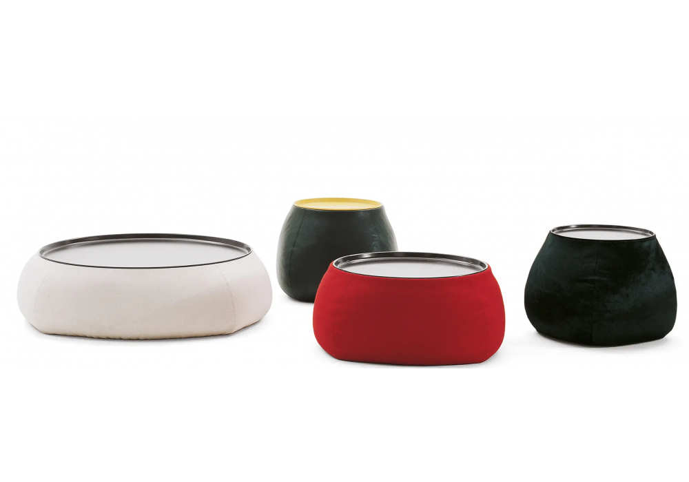 Fat-Fat & Lady-Fat diseñada por Patricia Urquiola para B&B Italia es una mesa auxiliar con estructura interna en material termoplástico en acabado naranja y revestimiento externo en diferentes tejidos o pieles. Bandeja en acero pintado o cobre bruñido. Disponible en diferentes medidas.