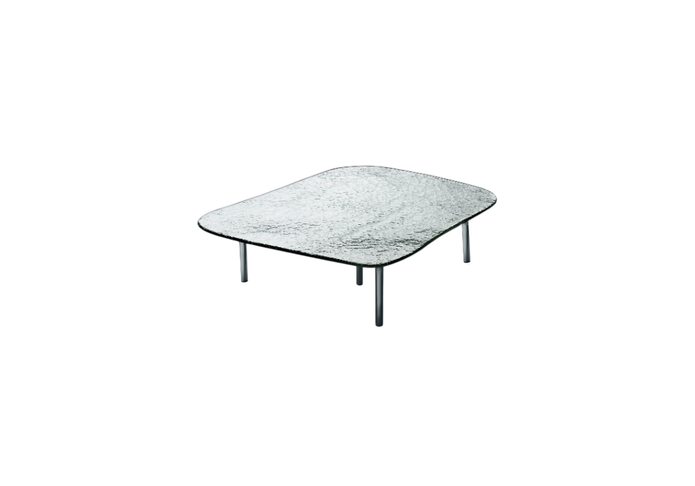 Specchio di Venere diseñado por Massimiliano Locatelli - CLS Architetti para Glas Italia es una mesa de centro con borde redondeado y elegantes patas delgadas de vidrio soplado. La parte superior de vidrio extralight transparente templado, el vidrio extralight plateado y las patas siempre están en el mismo acabado de la parte superior.