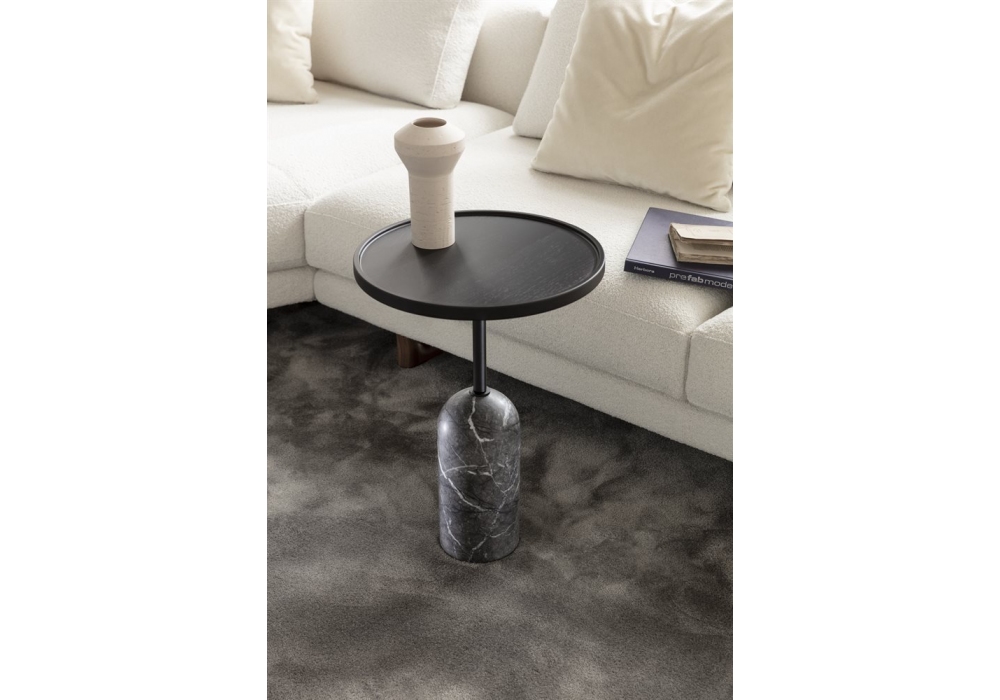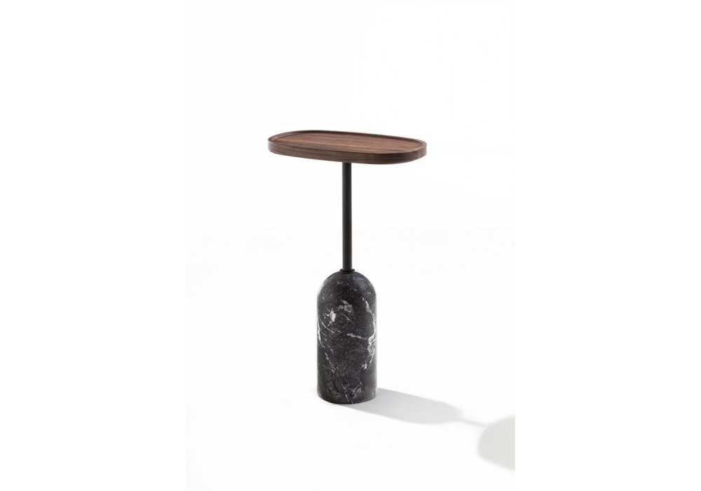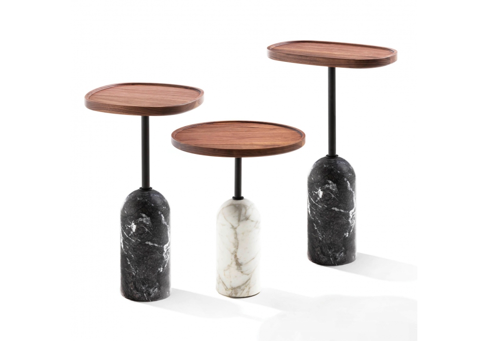 Ekero diseñada por Staffan Tollgarg para Porada es una mesita, propuesta en versión ovalada, redonda y cuadrada en tres alturas diferentes. Base en mármol blanco Carrara o Carnico gris, tallo central en metal pintado negro mate y parte superior en nogal canaletta macizo o en laca mate ligeramente cerrada.