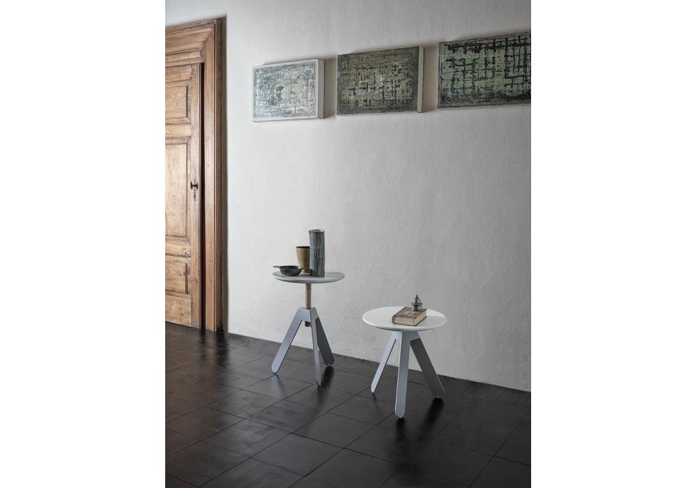 Basalto diseñada por Roberto Giacomuzzi para Bontempi es una mesita de altura regulable con estructura de acero lacado y tapa de madera disponible en diferentes acabados.