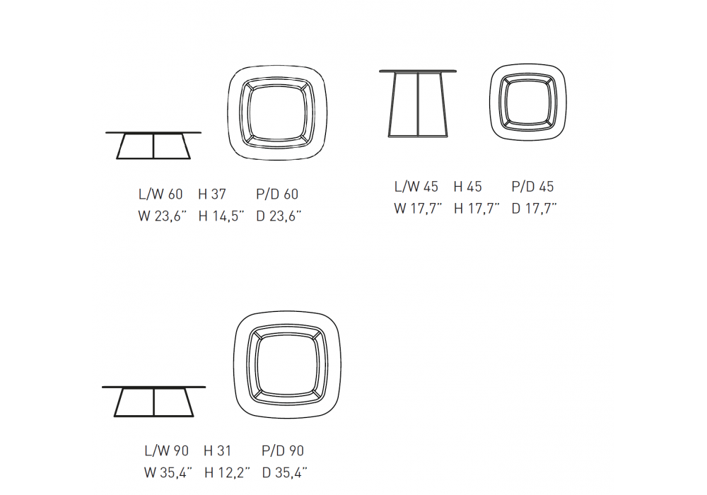 | Dimensiones | 45 x 45 x H 45 cm;; 60 x 60 x H 37 cm; 90 x 90 x H 31 cm. |