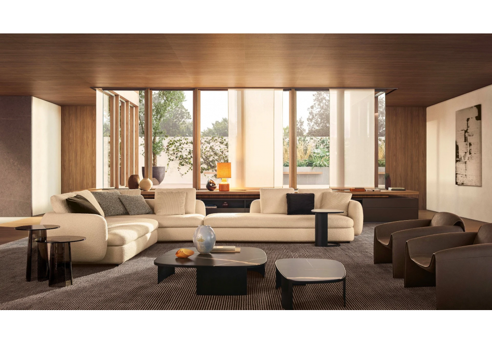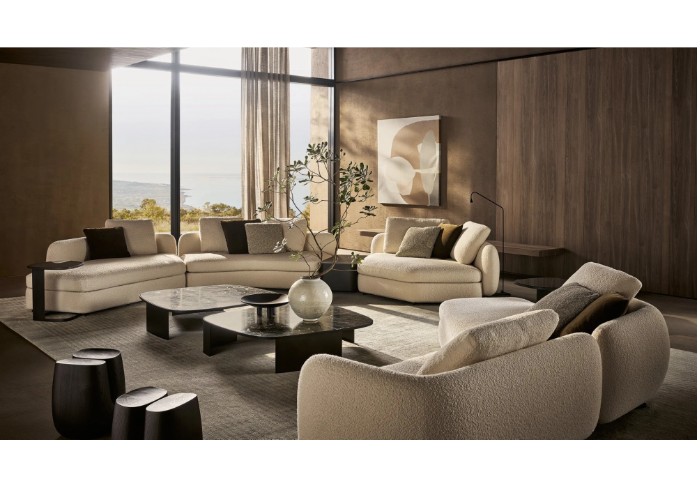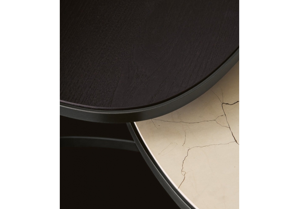 Koishi diseñada por Jean-Marie Massaud para Poliform es una colección de mesas auxiliares. Estructura de metal pintado mate en acabado champán o bruñido. Tablero disponible en mármol, piedra, madera o cristal.