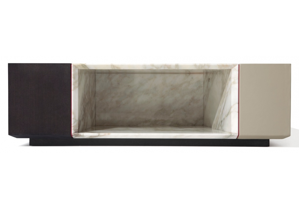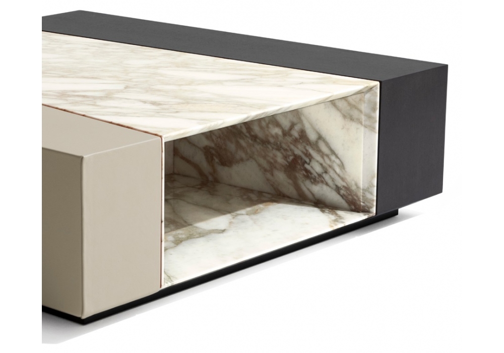 Scaleno diseñada por Giancarlo Bosio & Centro Ricerche para Giorgetti es una mesita con inserciones en mármol, piel y madera de fresno. Disponible en diferentes acabados.