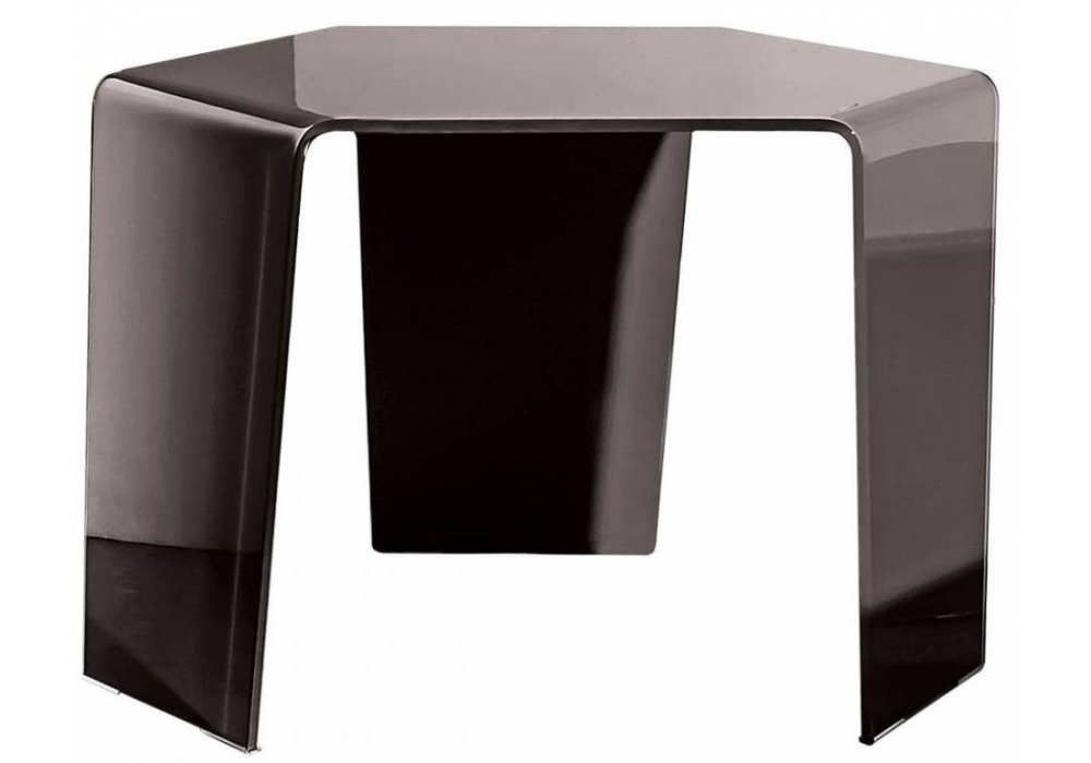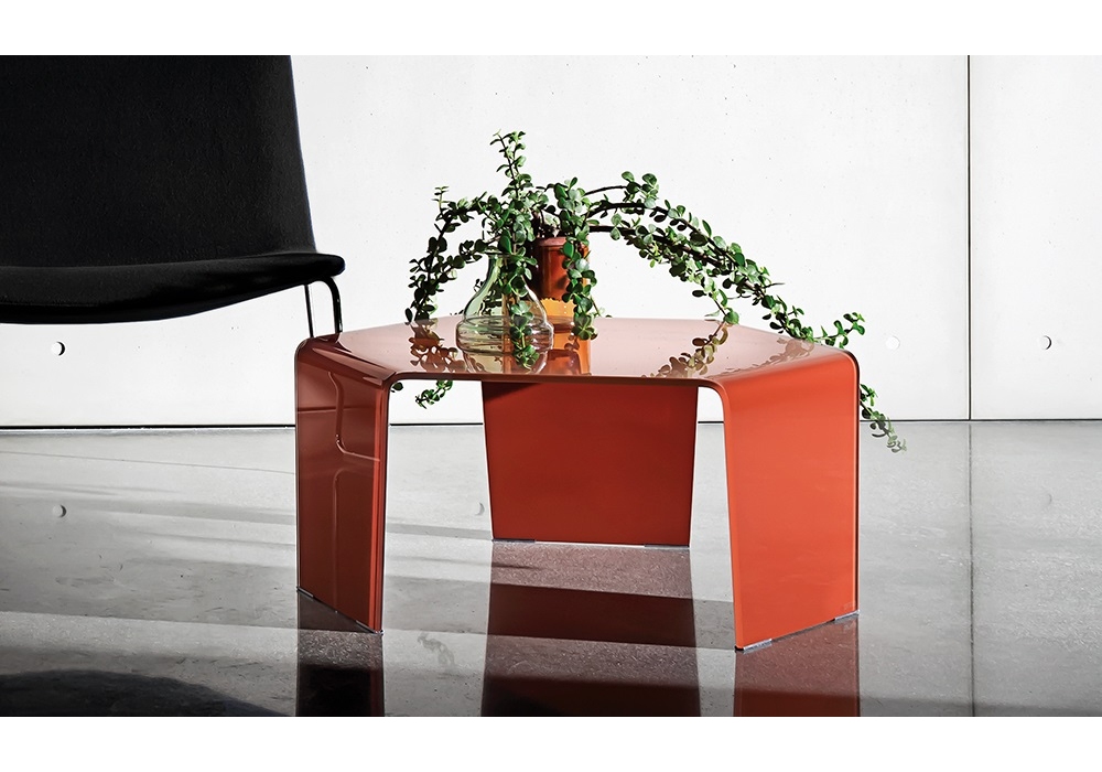 3 Feet diseñada por Gianluigi Landoni para Sovet es una mesita hexagonal en vidrio transparente, ahumado o lacado a mano. Disponible en diferentes acabados y dimensiones.