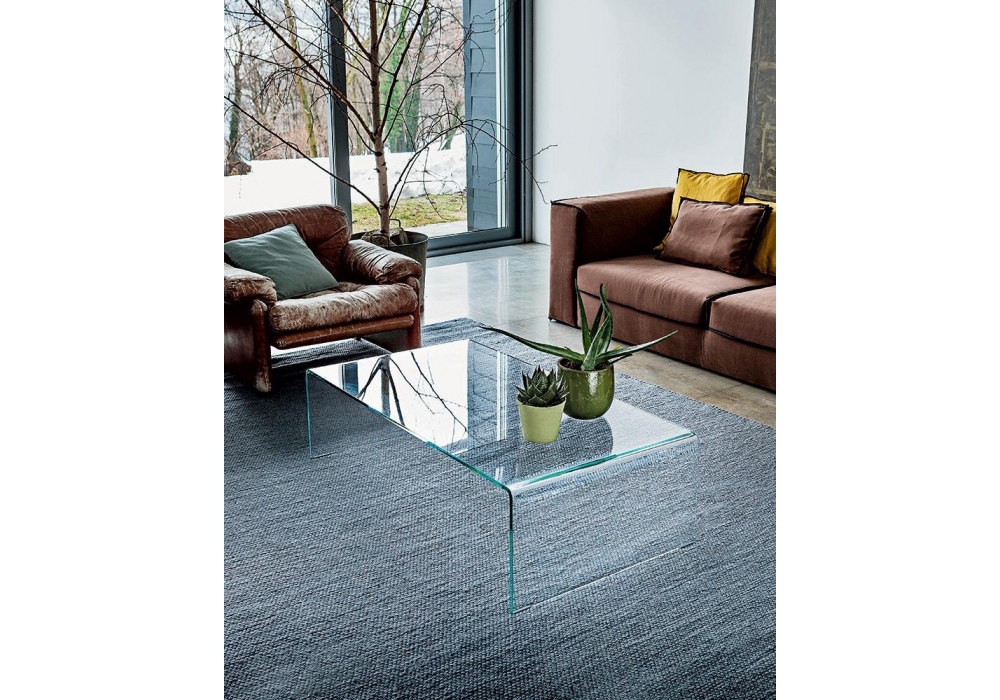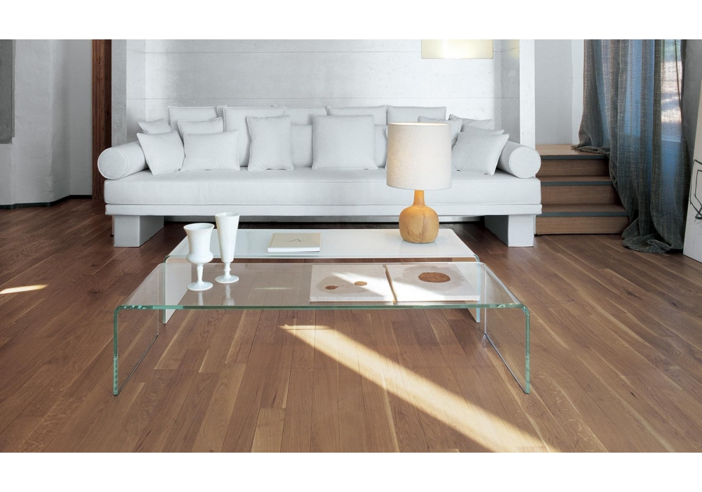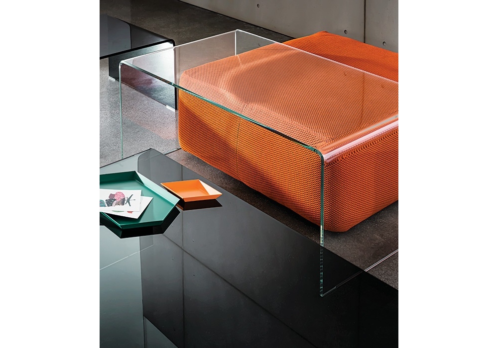 Bridge Rectangular diseñada por Studio Sovet para Sovet es una mesita en vidrio transparente, ahumado o lacado a mano. Disponible en diferentes acabados y dimensiones.