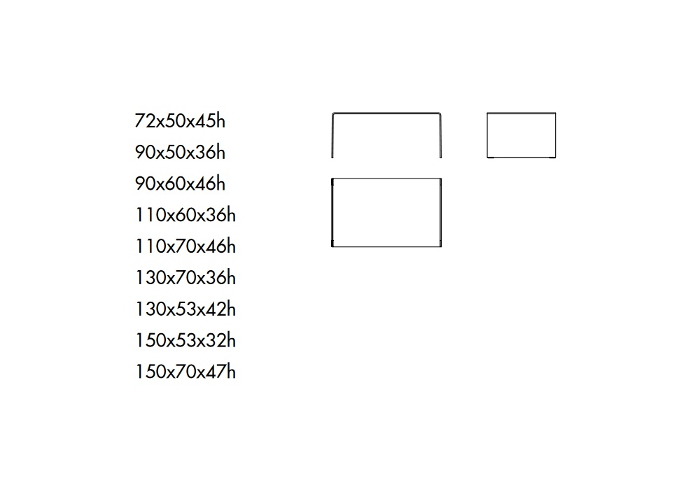 | Dimensiones | 72 x 50 x H 45 cm; 90 x 50 x H 36 cm; 90 x 60 x H 46 cm; 110 x 60 x H 36 cm; 110 x 70 x H 46 cm; 130 x 70 x H 36 cm; 130 x 53 x H 42 cm; 150 x 53 x H 32 cm; 150 x 70 x H 47 cm |