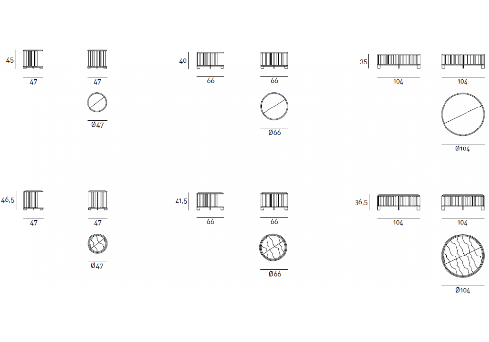 | Dimensiones | Marble: • Ø 47 x H 46.5 cm; • Ø 66 x H 41.5 cm: • Ø 104 x H 36.5 cm; Wood: • Ø 47 x H 45 cm; • Ø 66 x H 40 cm; • Ø 104 x H 35 cm |