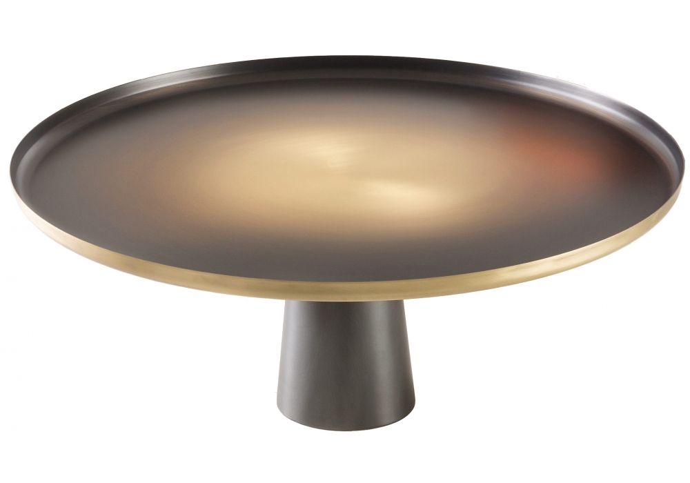 Sunrise diseñada por Artefatto para DeCastelli es una mesita redonda en latón o cobre, con tapa en forma de bandeja y base cónica. Disponible en diferentes acabados.