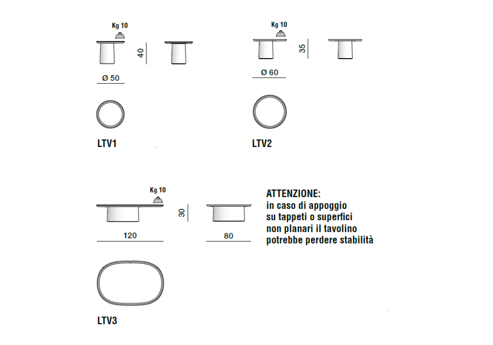 | Dimensiones | Ø 50 x H 40 cm; Ø 60 x H 35 cm; 120 x 80 x H 30 cm |