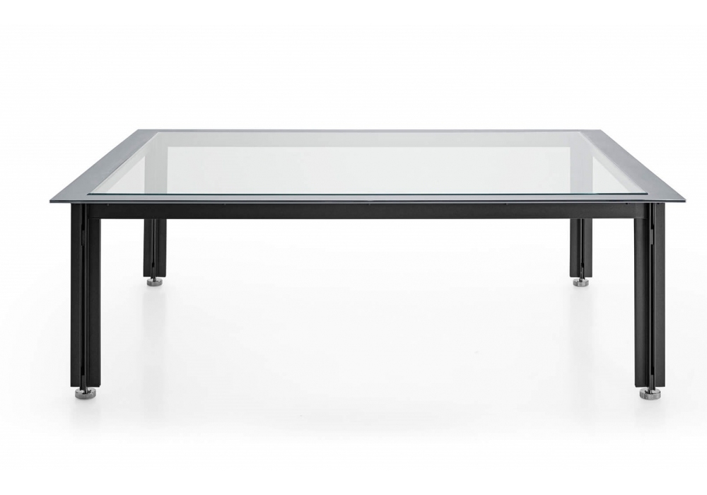 Fasce Cromate diseñada por Luigi Caccia Dominioni para Azucena es una mesa con tablero en vidrio transparente extra claro con bandas perimetrales cromadas, base de acero con acabado gris metalizado. Disponible en tres tamaños.