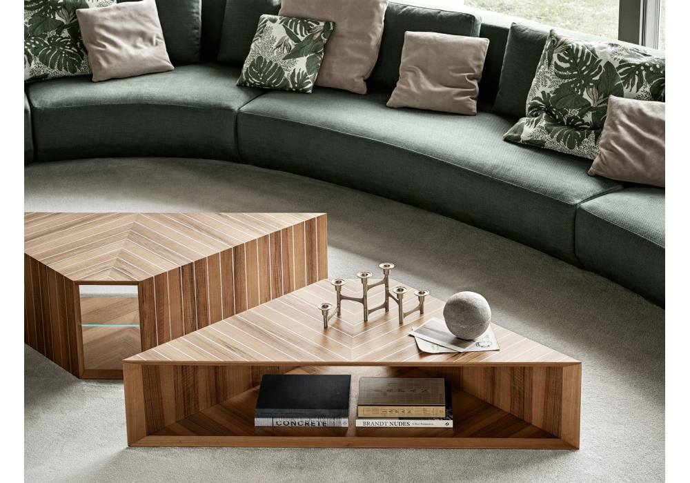 Prism Low diseñada por David / Nicolas para Gallotti&Radice es una mesita en nogal “Colore” Frisé con incrustaciones de aluminio natural o India Rosewood con incrustaciones de aluminio natural. Versión de 37 cm h equipada con estante interior de cristal templado extralight de 8 mm de espesor. Disponible en 4 medidas.