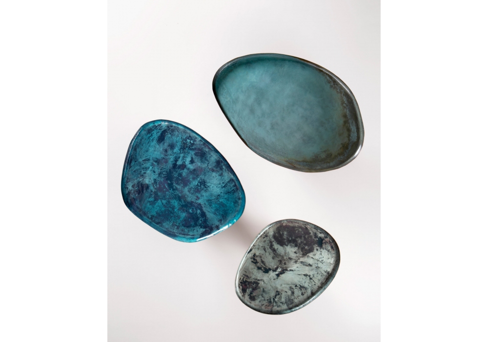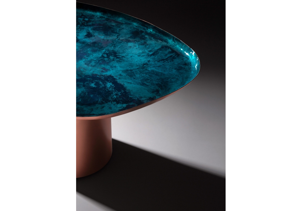 Drops diseñada por Zanellato y Bortotto para DeCastelli es una mesita de cobre con tapa de forma orgánica. Disponible en 3 dimensiones.
