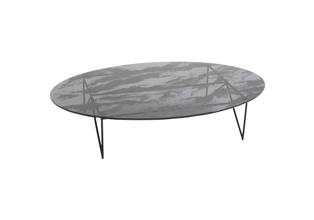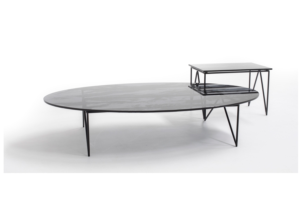 Aerozeppelin diseñada por Diesel Creative Team para Diesel con Moroso es una mesita con tapa de cristal ahumado negro con serigrafía vitrificada y base en acero pintado en polvo. Está disponible en diferentes formas y tamaños.