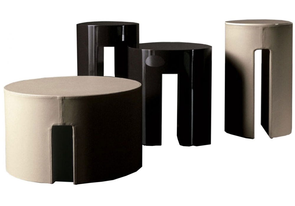Gong diseñada por Andrea Parisio de Meridiani es una colección de mesas bajas con estructura en madera. Disponible en enchapado en roble teñido, lacado mate o brillante, resina, revestido en cuero.