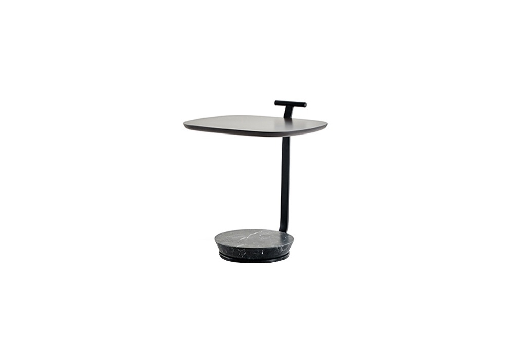 Surf diseñada por Yabu Pushelberg para Molteni&C es una mesa auxiliar realizada con estructura de metal acabado peltre, balda lacada antracita mate y base de mármol negro Marquina.