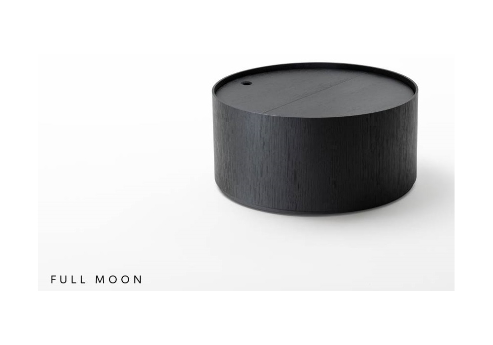 Moon diseñada por Mist-o para Living Divani es una mesita en madera de roble, disponible en diferentes alturas y diámetros compuesta por cilindros y semicilindros, fijos y abribles.