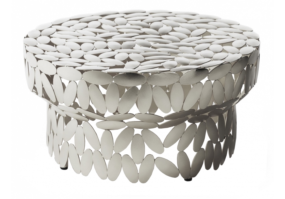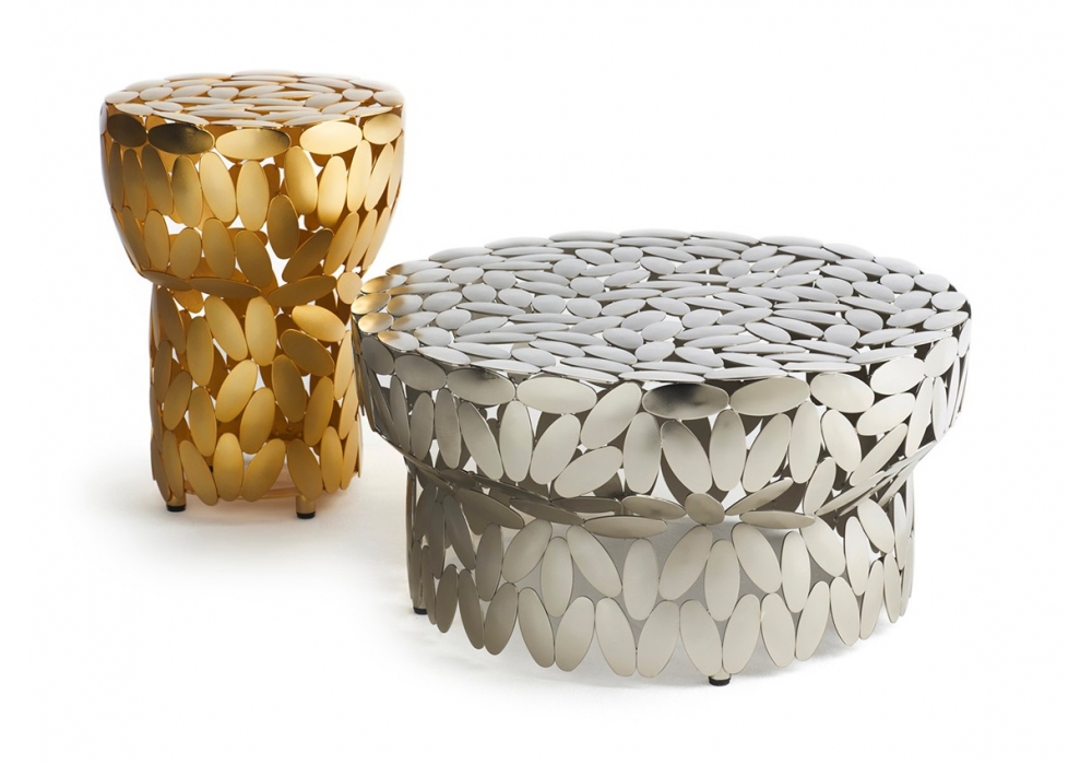 Foliae Collection diseñada por Roberto Mora para Opinion Ciatti es una mesita de acero realizada con decoraciones en forma de hoja soldadas a mano. Disponible en diferentes acabados.