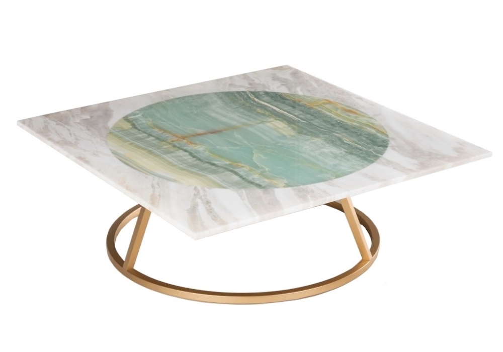 Pantheon diseñada por Maarten De Ceulaer para Budri es una mesita cuadrada realizada con un fondo en mármol Bianco Nuvola y un círculo central en mármol Azul Sky. Base en metal dorado satinado y cepillado.