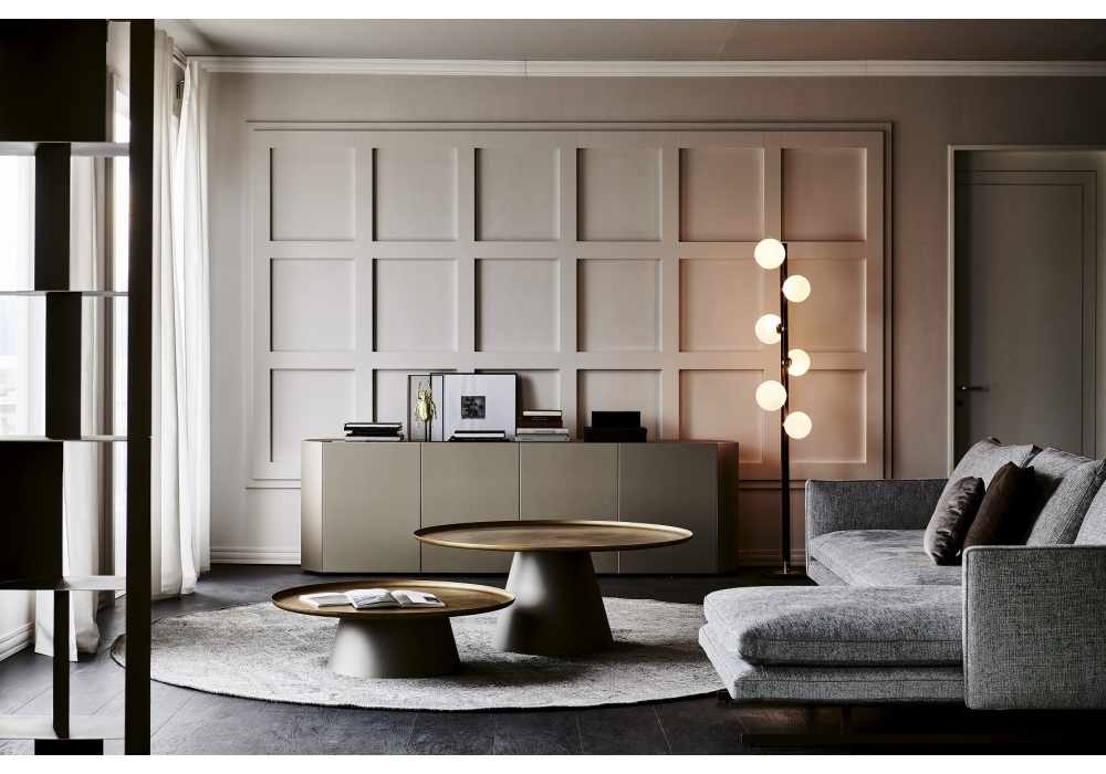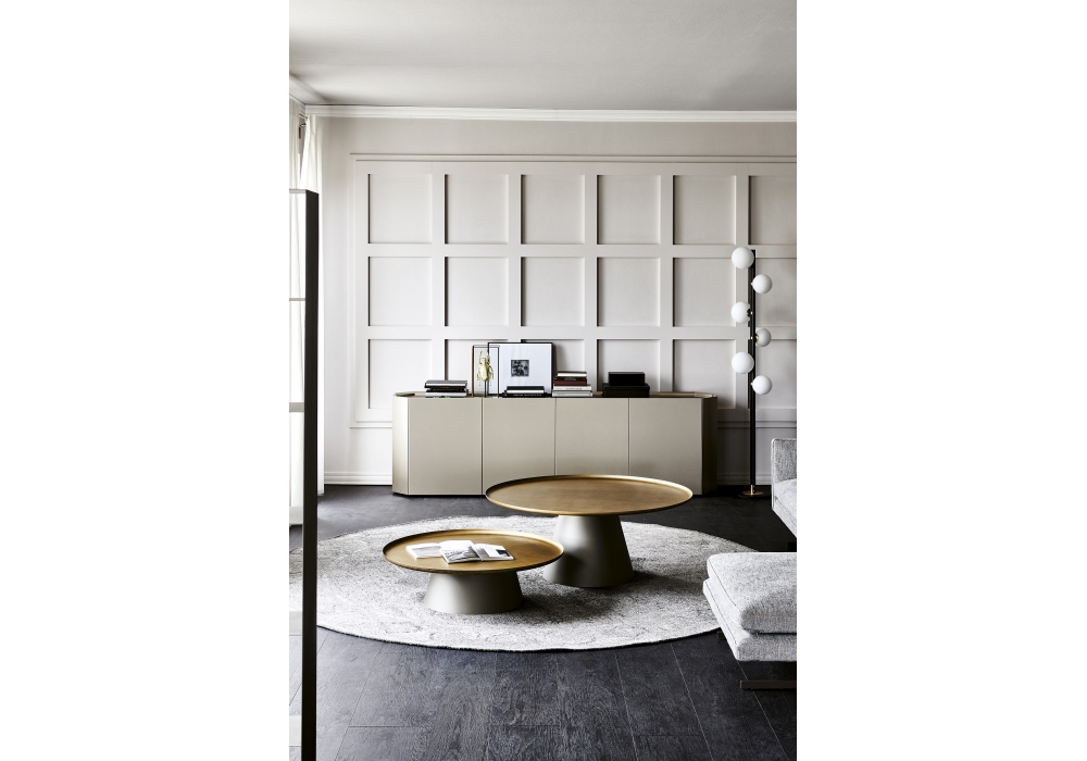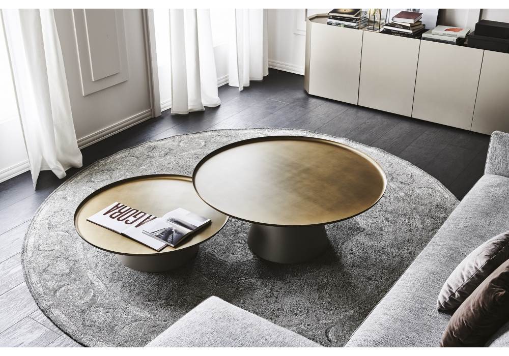 Amerigo diseñado por Giorgio Cattelan para Cattelan Italia es una mesita con sobre en acero Brushed Brass, Brushed Bronze o Brushed Grey y base en acero barnizado gofrado titanio.