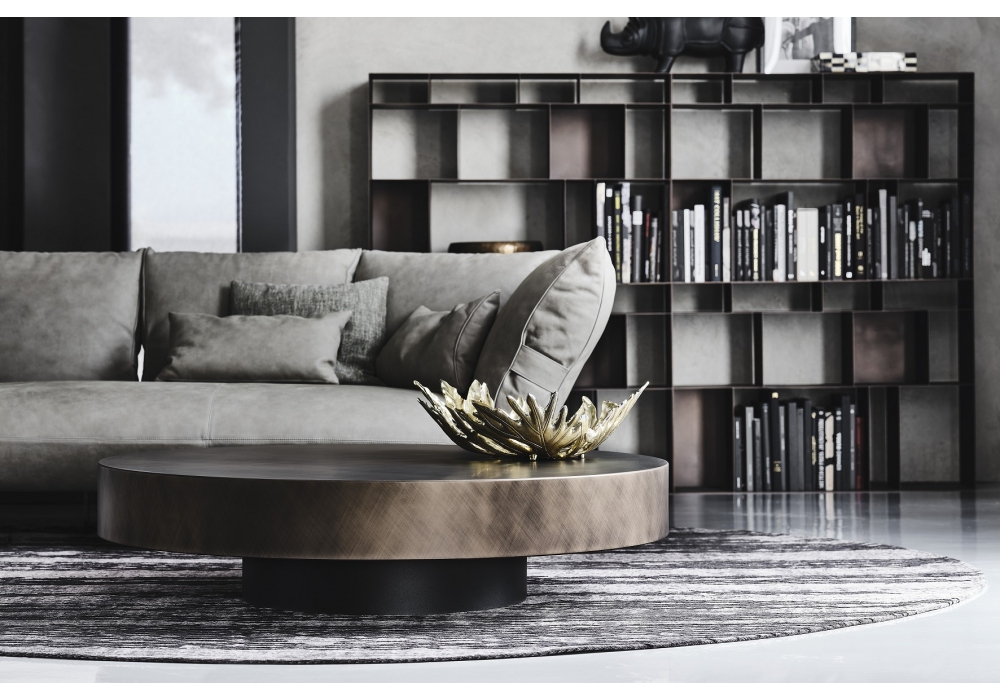 Arena diseñado por Yasuhiro Shito para Cattelan Italia es una mesita con sobre en acabado lacado Brushed Bronze o Brushed Grey y base en acero barnizado gofrado negro.